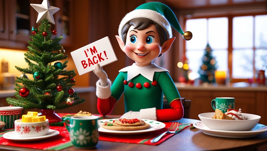 Holiday Elf at festive breakfast table with 'I'm Back!' sign and treats