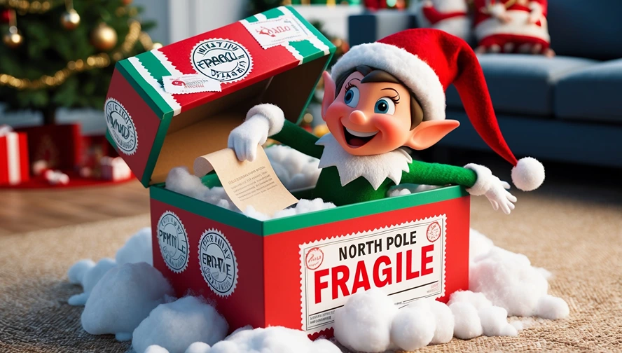 Holiday Elf popping out of a 'Fragile' labeled box with cotton snow